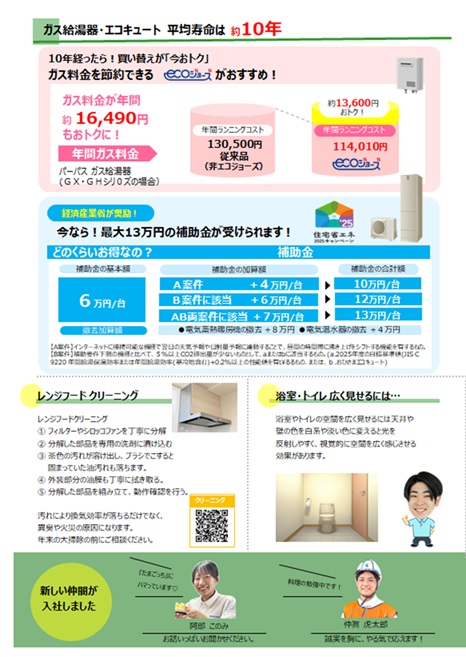 給湯器・エコキュート(補助金)や社外イベント、スタッフ紹介に加え、
