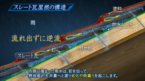 今回のようなスレート瓦屋根は、瓦の縦の継ぎ目から入った雨水が瓦と瓦の上下の重なる部分から流れていく構造のため、重なる部分を塗装工事での塗料で塞いでしまうと逃げ場がなくなった雨水は瓦の内側に溜まります。内側に溜まった雨水は瓦を留めている釘をつたって、天井裏へと流れ劣化や雨漏りを引き起こします。