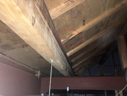 水を当てる前に天井裏を覗いてみると、木下地に水が染みたような跡が確認できました。