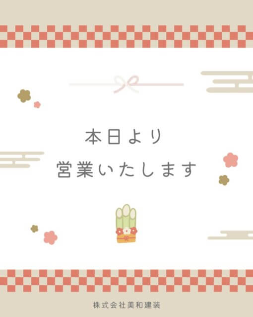 NEW! 2026.01.05 本日より営業スタートいたします 新年あけましておめでとうございます。 美和建装は、本日より2026年の営業を開始いたしました。 旧年中は、地域の皆さまをはじめ多くのお客様にご縁をいただき、心より感謝申し上げます。 本年も「お客様に喜ばれる仕事」を大切に、…