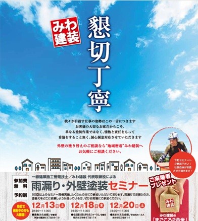 NEW! 2025.12.05 12月度塗り替えセミナー 開催のお知らせ 住まいづくりに役立つ 『塗り替えセミナー』 を毎月開催しています。 12月度も 外壁塗装を検討されている方に向けて、分かりやすくお伝えする内容をご用意しました。 開催内容や日時、参加方法などの詳細はブログにて詳しくご紹介…
