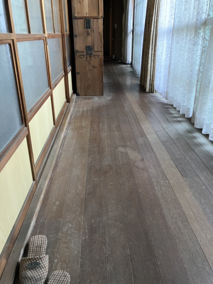 日常生活の中でどうしても蓄積してしまう細かなキズや汚れ、ワックスの劣化により、床の印象が暗くなっている状態でした。