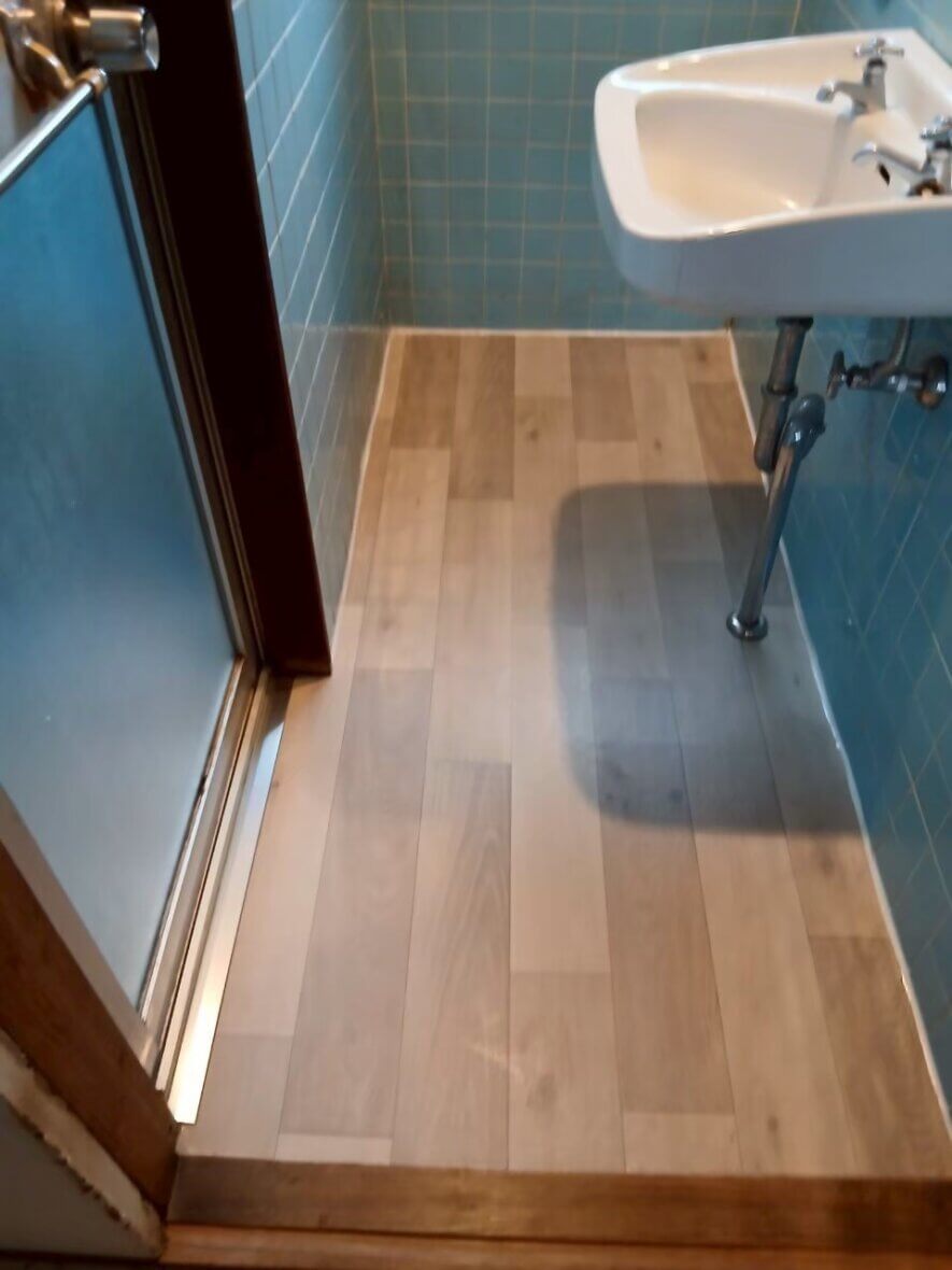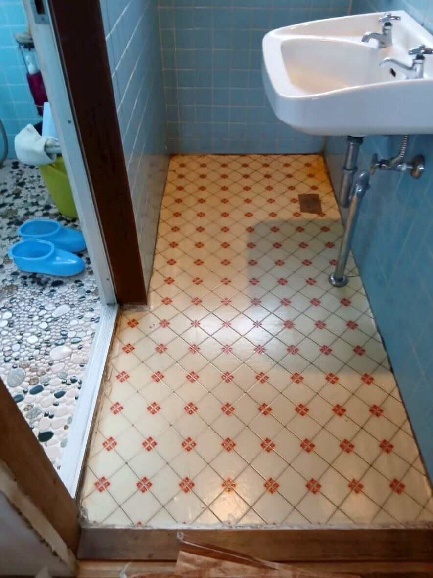 排水口を埋めたいとのことで床貼りを行いました。
